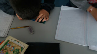 Enviou-me agora umas fotos e um vídeo a trabalhar matemática extra, em exercícios marcados pela mãe, com divisões e multiplicações.