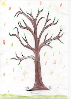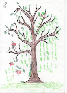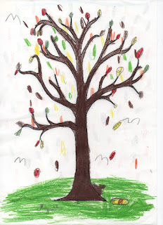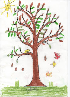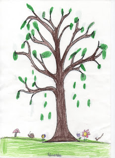 Recebemos o desenho do tronco de uma árvore que já usamos para criar com os nossos dedos as árvores do Outono. A ideia era explorar mais uma vez a noção de "diversidade", também...