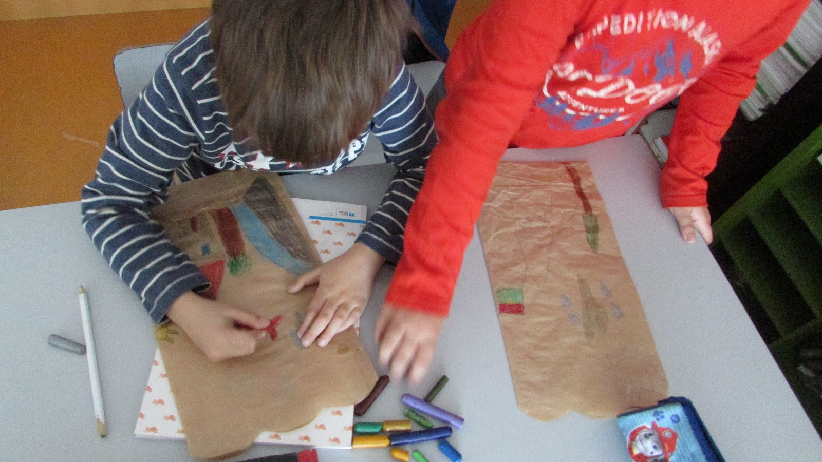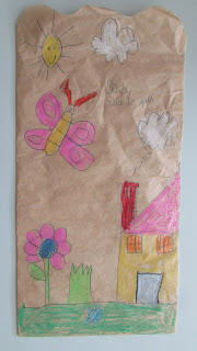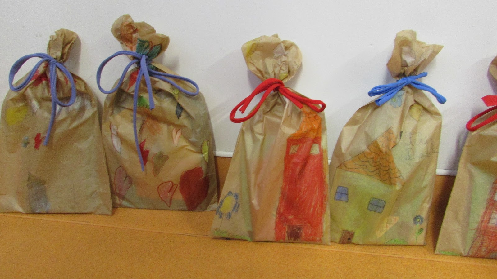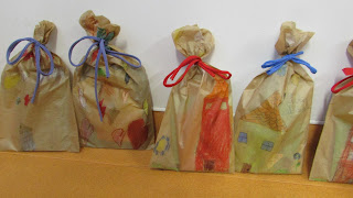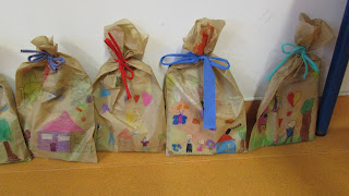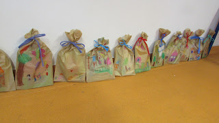 Faltava embrulhar os presentes. Cada um recebeu um saco de papel que ilustrou e pintou. As prendas para o Pai foram colocadas lá dentro (o quadro e os postais). Havia fitas de muitas cores e cada um escolheu a que queria para amarrar o seu saco.