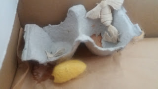 Já tinha saído de um casulo uma mas logo morreu! Hoje ficamos muito felizes por ver que numa caixa havia duas... Um casal, esperávamos nós! Ficaram muito juntinhas, num canto da caixa para o acasalamento. A outra é que ainda está sozinha, coitadinha!