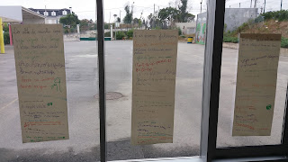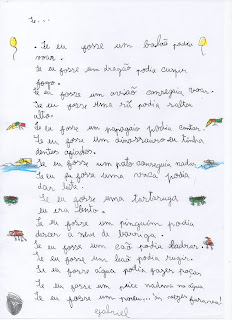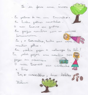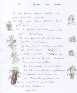 Nos vidros esperavam-nos duas tarefas para depois da conversa: cobrir árvores de folhas, usando os tinta e os nossos dedos e criar poemas a partir do primeiro verso apresentado.