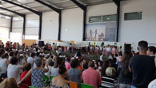 O espaço mais amplo da escola é o refeitório e foi aí que se organizou um semicírculo para os mais pequenos e uma plateia para os maiores. A sala estava completamente cheia!